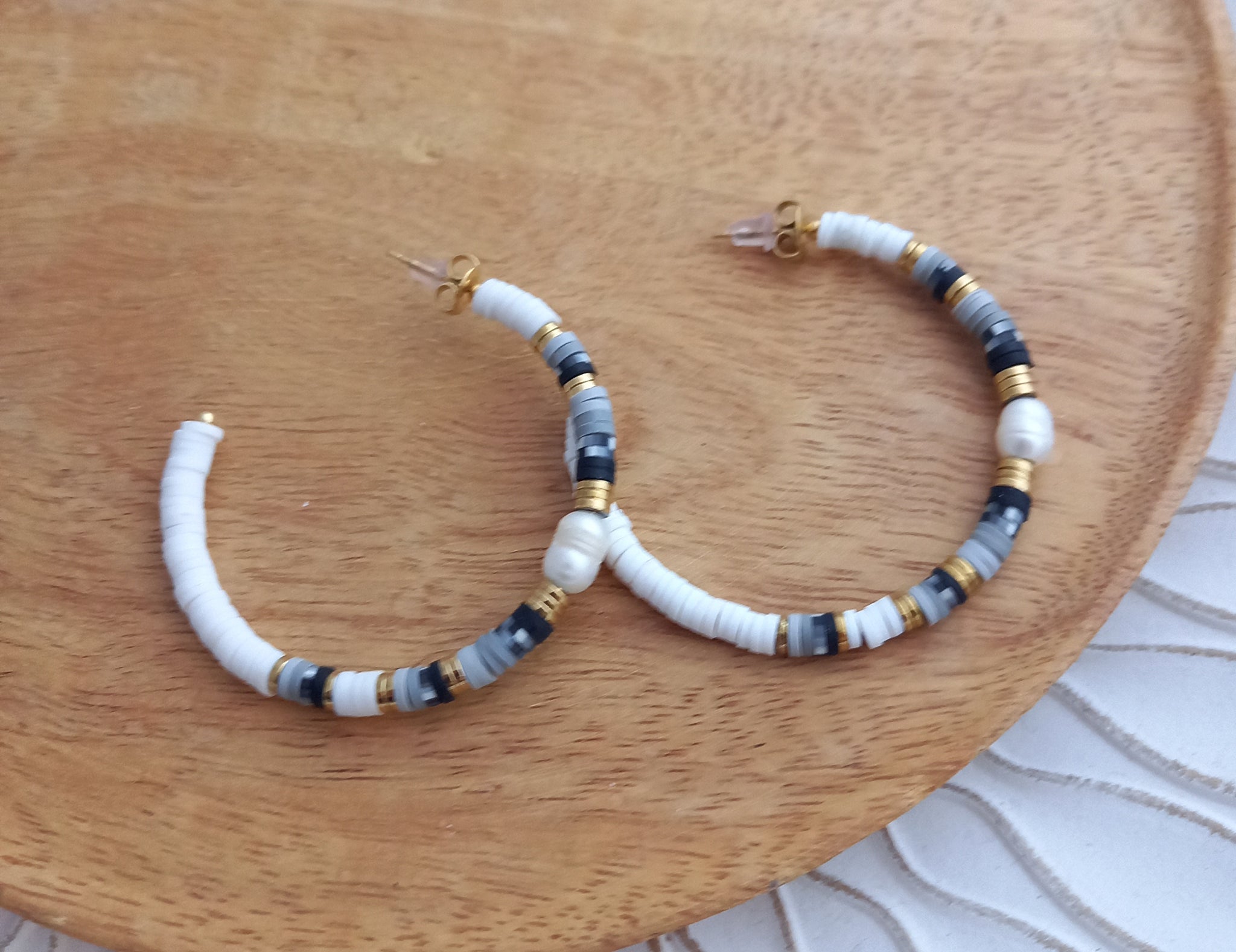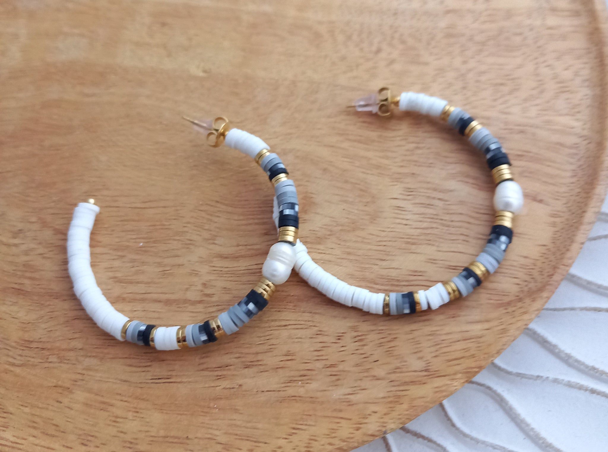 Boucles d'oreilles   Acier inoxydable Créoles Blanc Noir Fait-main