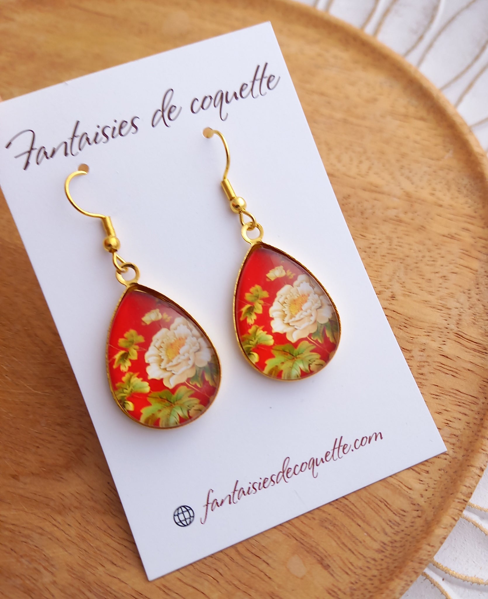 Boucles d'oreilles   Gouttes dorées  illustrées fleurs rouges   ❤ Fait main ❤
